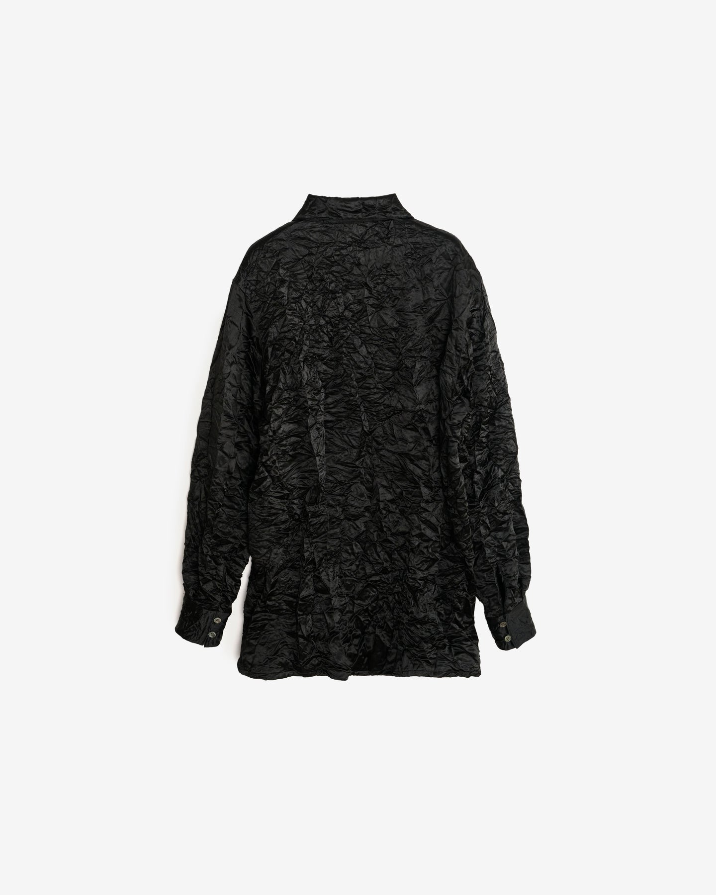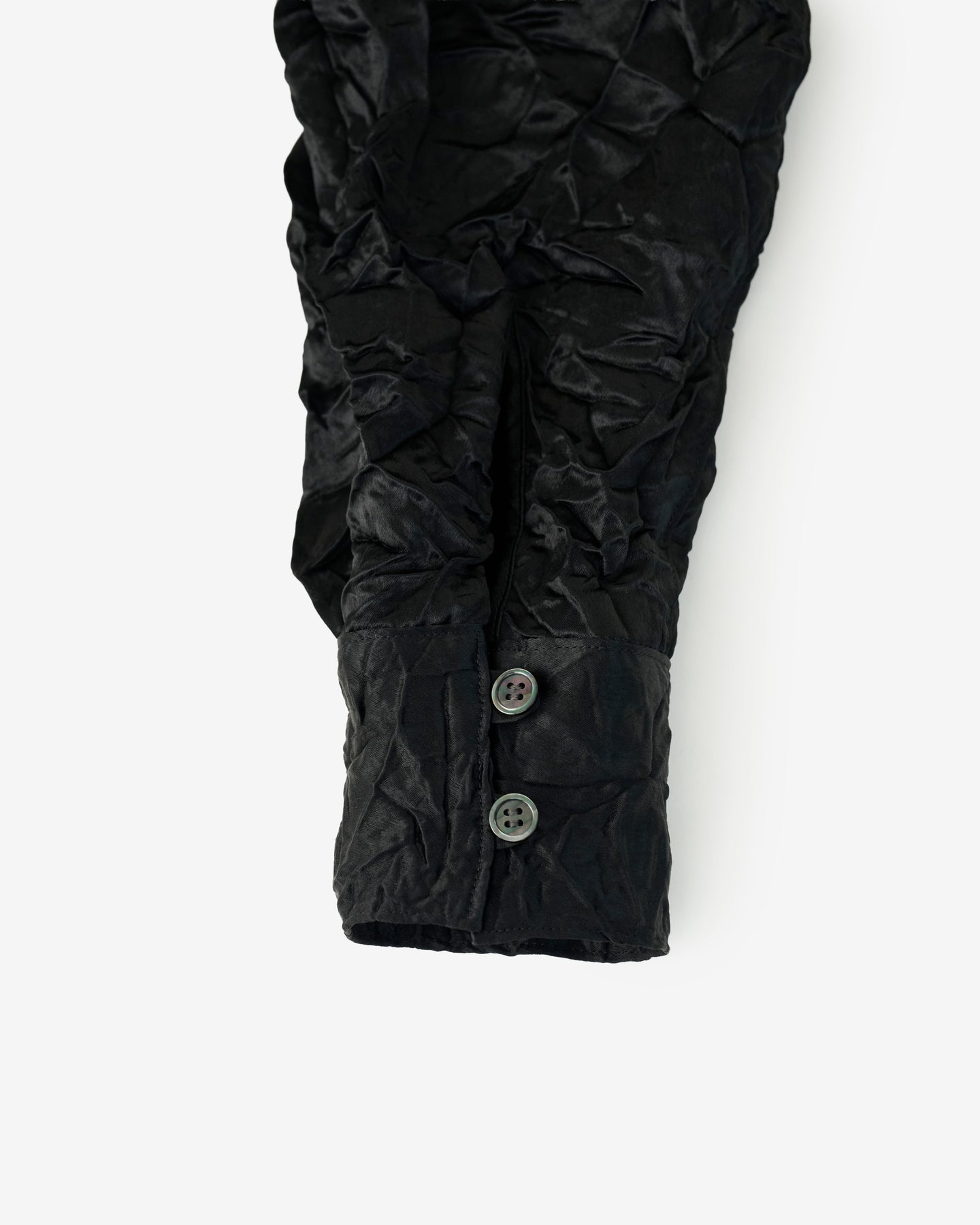 This shirt is made from an original material that combines the beautiful sheen of acetate, ENOF's signature fabric, with a wrinkled finish that could be considered a contrast. The new elegance born from the harmony of these two opposing features embodies the ENOF concept. The wrinkled finish gives the fabric an accordion-like stretch, making it very comfortable to wear.